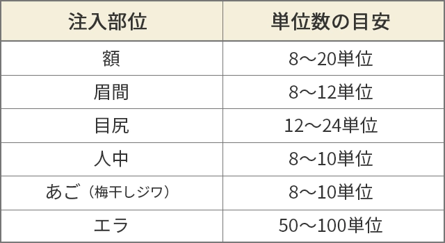 ボトックスの適正量は部位ごとに異なりますので、下の表を参考にしてみてください。