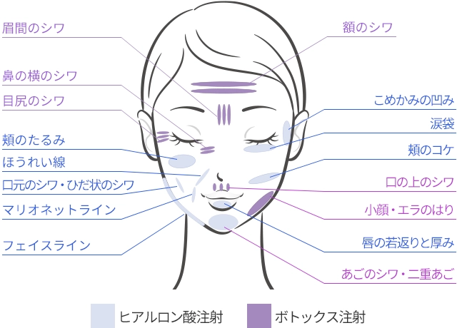 また当院ではボトックス注射とヒアルロン酸注射のW効果を狙ったシワ治療を行なっています。お顔の部位と患者様のシワの状態に合わせて、それぞれ効果がある注射と適正量を判断し選択しながら最大限の効果を狙った治療を進めていきます。